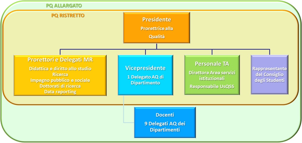 Il Presidio della Qualità per il triennio 2020/2022 è stato nominato con D.R 1043 del 20/12/2019 (correzione errore materiale con D.R. 1050/2019modifica Coordinatore Commissione Didattica con D.R. 930 del 16/12/2020, modifica composizione Commissione Didattica con D.R. 1029 del 28/10/2021 e con D.R. 1238 del 20/12/2021) con una composizione strutturata in Commissioni secondo lo schema riportato al seguente link.